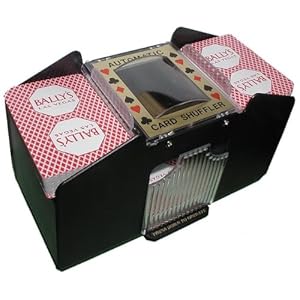 Deluxe 4 Deck Card Shuffler Tired of fumbling with a deck of cards? Here's an easy way to eliminate the dropped cards and sore fingers! Shuffles cards quickly and thoroughly, so you don't have to. Automatically shuffles 1-4 decks. Fingertip control for quick and easy shuffling. Requires 4 AA batteries (not included). Ideal for Poker, Rummy, Canasta, Pinochle, Blackjack and War. Includes 1 deck of premium quality cards free.